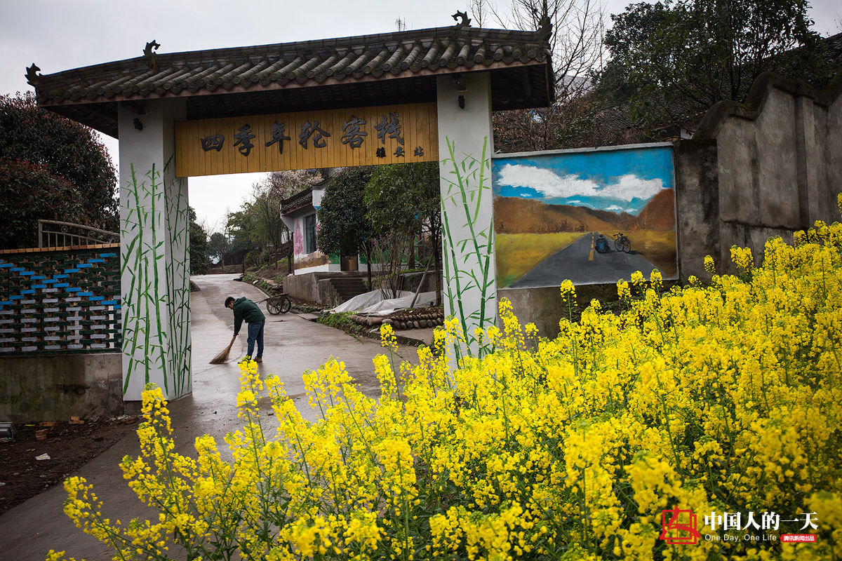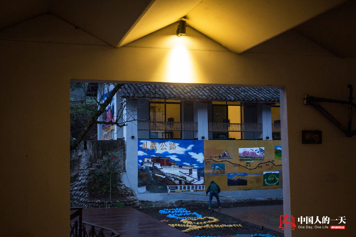 历时半年,骑友客栈终于完工。欧洪明戴着骑行头盔,背后是川藏线水彩景观图。