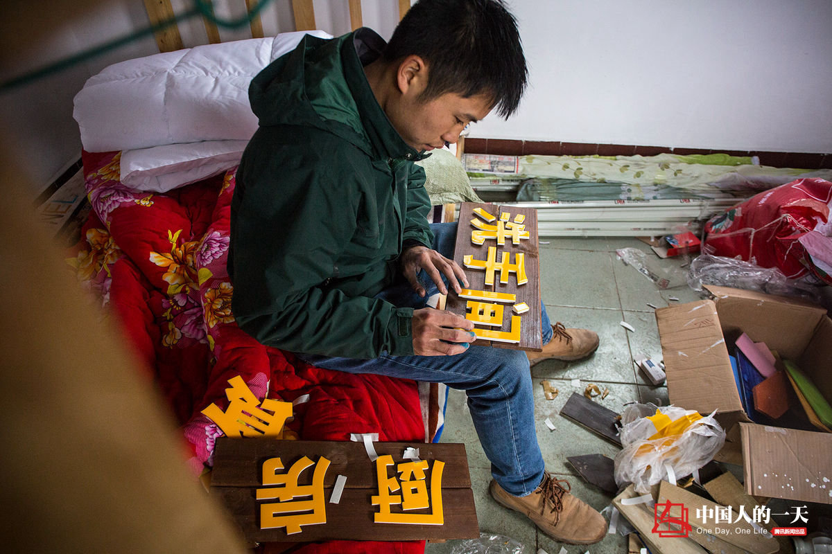欧洪明2011年读大学时,对西藏产生了浓厚的兴趣,梦想着骑着自行车去拉萨。大学期间他省吃俭用,用零用钱买了一辆自行车,期待着梦想之旅。图为欧洪明在制作洗手间的指示牌。为了节约经费,俱乐部的材料都是DIY的。