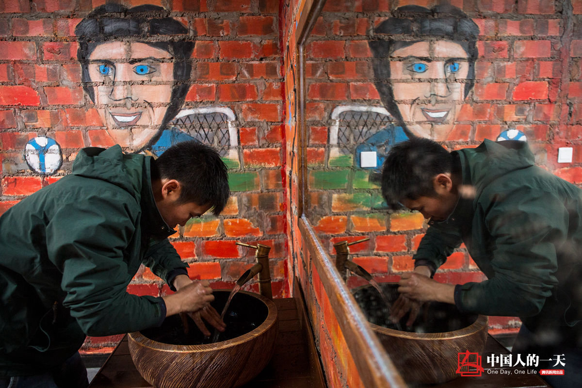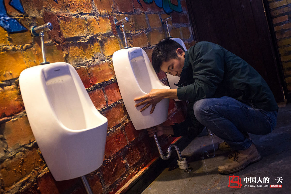 当车队到达通麦天险时,欧与队友不慎跌入十几米深的山谷,幸亏深谷底部有大量积水,但欧洪明在呛水后无力拉起队友。危急时刻,藏民用厚实的臂膀托起受伤队员,然后搀扶起欧洪明,上岸后藏民开车将他们送到一百多公里外的林芝。万幸的是队友只是受了皮外伤,休整几日便康复。图为欧洪明正在检修男厕所的小便池。