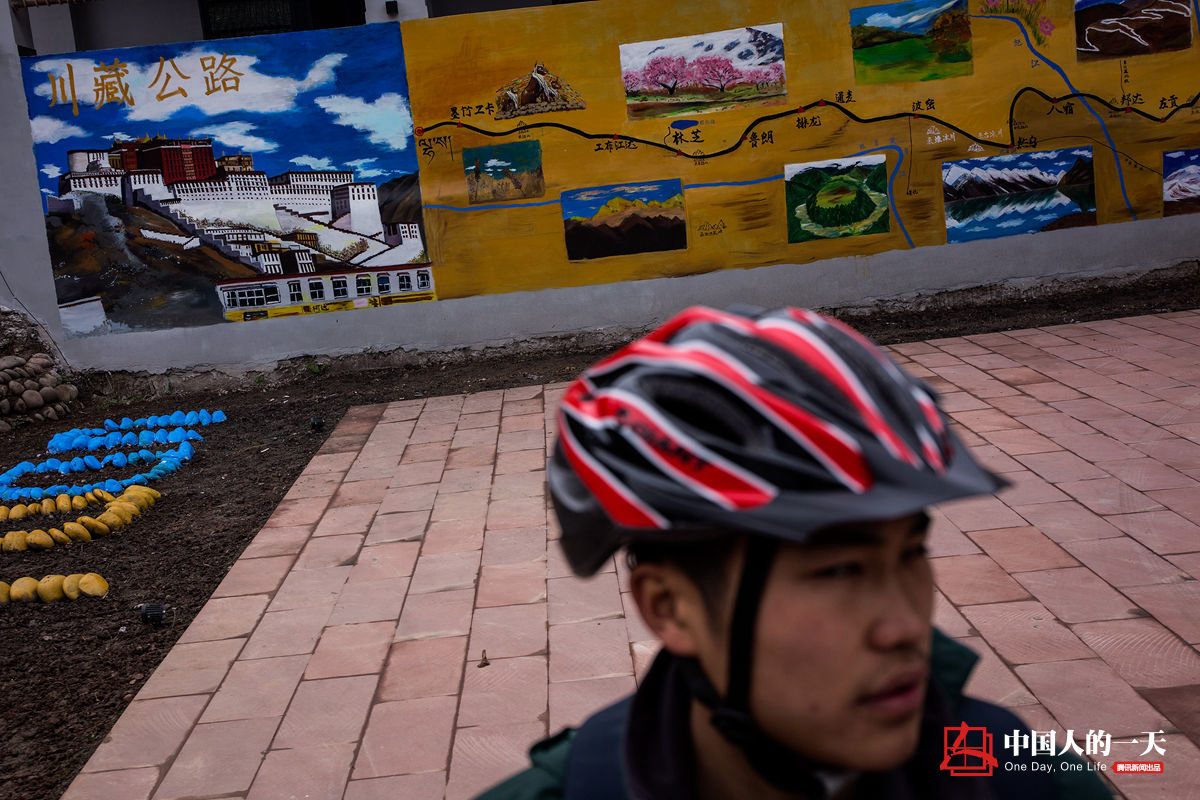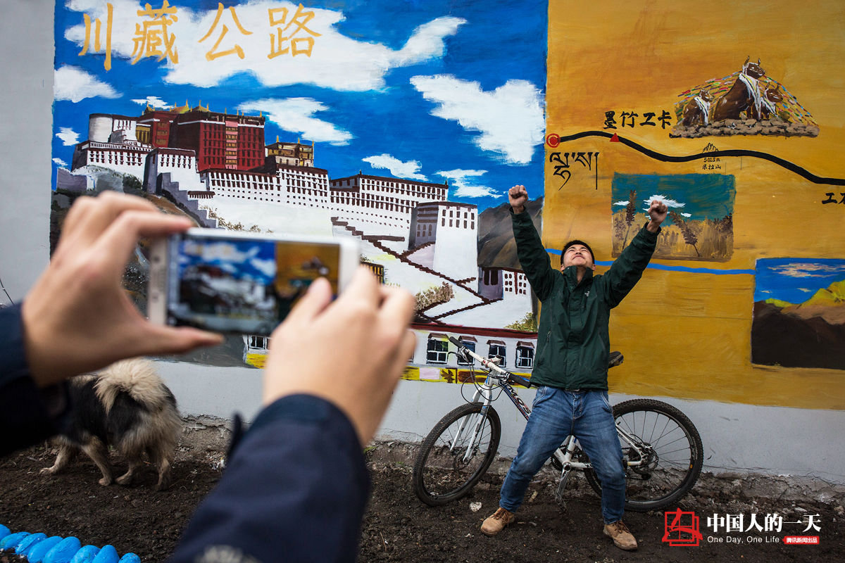 离开新疆后,欧洪明来到西藏拉萨,成为一名筑路工作者。在海拔4000米的高原,勘探筑路并不轻松,但欧洪明是快乐的,特别是当他见到从东边前来布达拉宫“朝圣”的骑行者时。感同身受,他萌生了建立一家318线“骑行者交流平台”的想法。图为欧洪明给川藏线景观图刷层清漆。