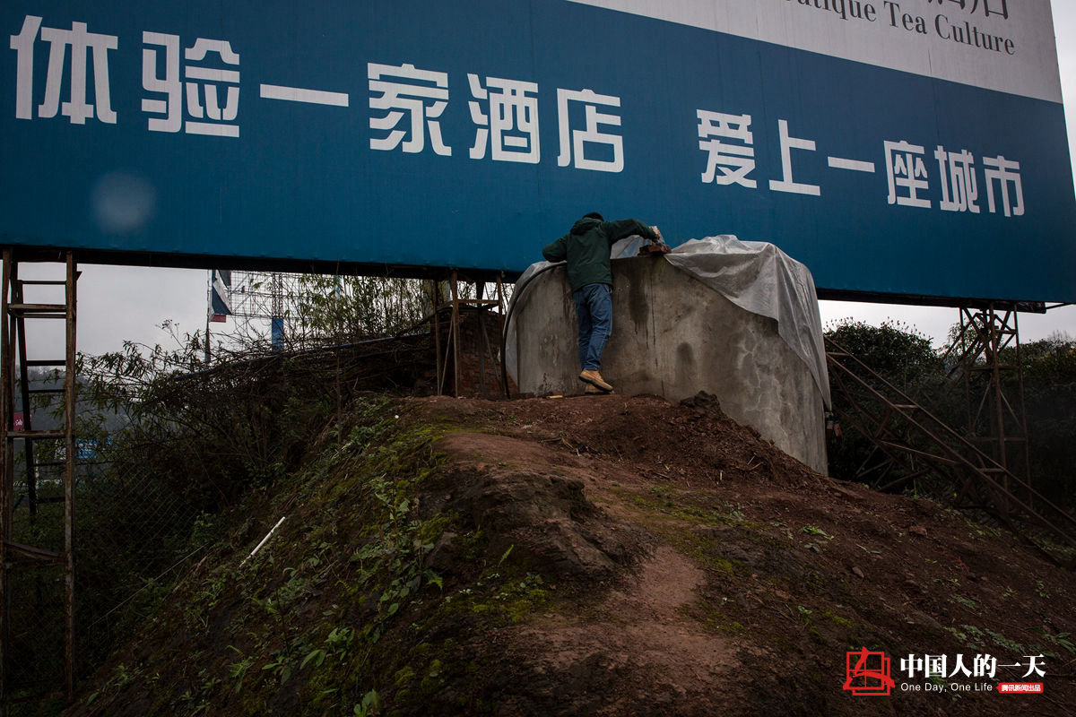欧洪明正在山顶检查水箱,他头顶上方是雅安市一家星级酒店的巨型广告牌。欧洪明说:“俱乐部不是酒店,是共同热爱川藏线的骑行者的家”。