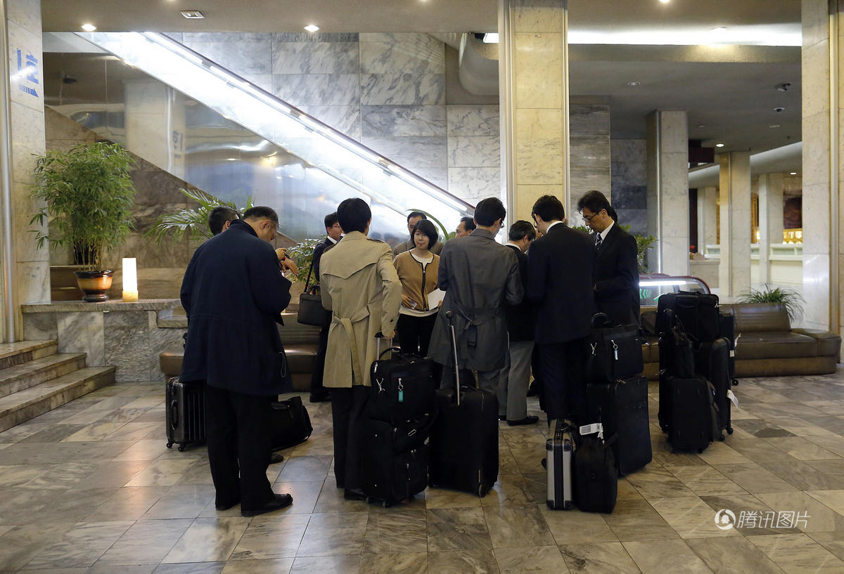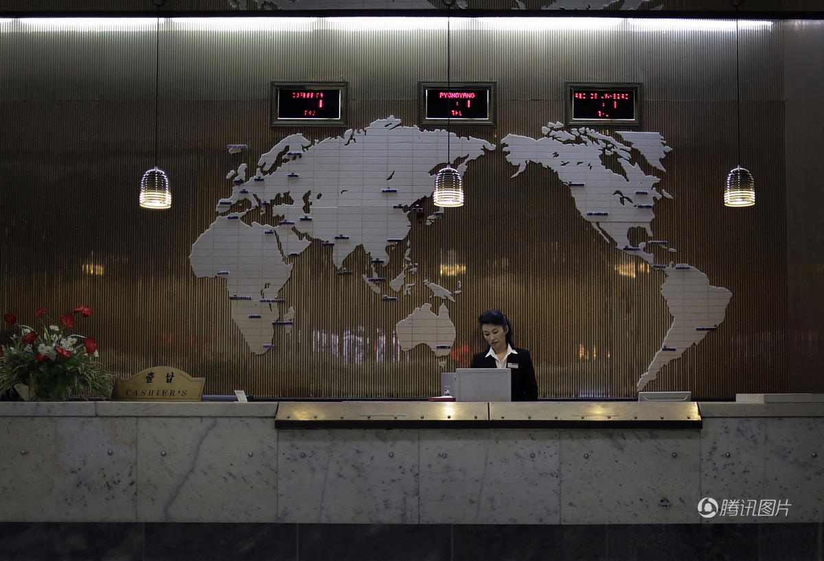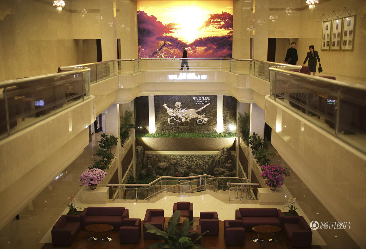 4月10日,平壤高丽酒店,一名员工穿梭在金碧辉煌的大堂。高丽酒店,是朝鲜首都的一家涉外酒店,与羊角岛国际饭店同为朝鲜最高级酒店设施,一直是朝鲜最为著名的地标建筑之一。2015年6月,高丽酒店36楼走廊发生火灾,酒店经过近两年的修复装潢,将于本周重新营业。