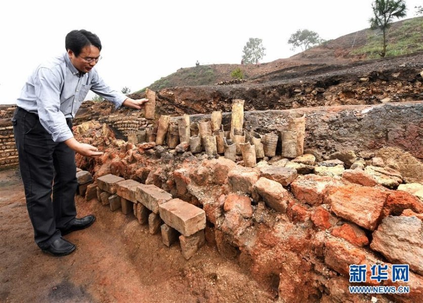图为在湖南桂阳桐木岭矿冶遗址,考古工作者展示用于提炼矿物的坩埚(2016年11月18日摄)。新华社记者李贺摄