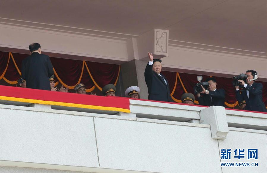 4月15日,在朝鲜首都平壤,朝鲜最高领导人金正恩(前中)向参加群众游行的平壤市民挥手致意。朝鲜15日在平壤举行纪念金日成诞辰105周年的阅兵式和群众游行,并展示了朝鲜最先进的导弹装备。新华社记者朱龙川摄
