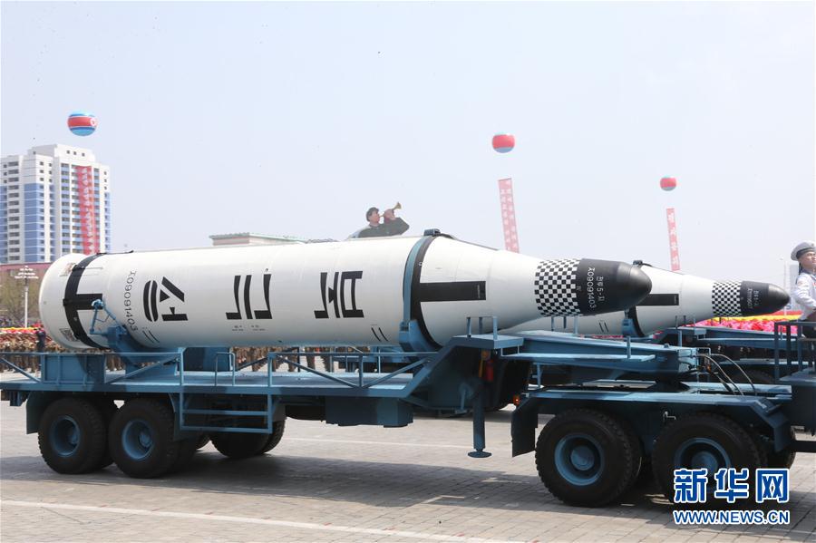 这是4月15日在朝鲜首都平壤举行的阅兵式上拍摄的“北极星—2”型潜射中程弹道导弹。朝鲜15日在平壤举行纪念金日成诞辰105周年的阅兵式和群众游行,并展示了朝鲜最先进的导弹装备。新华社记者朱龙川摄