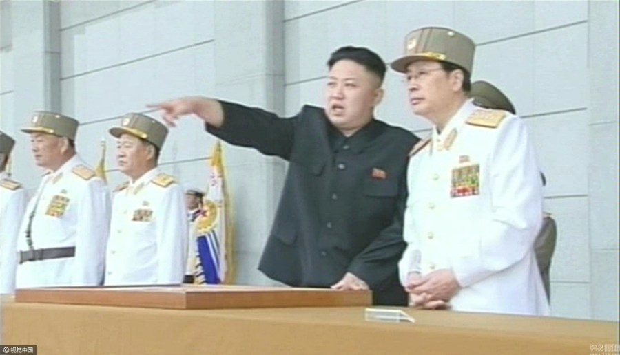 当地时间2013年4月25日,朝鲜平壤,金正恩出席建军81周年大阅兵,观看阅兵式的军官集体着白色军服。