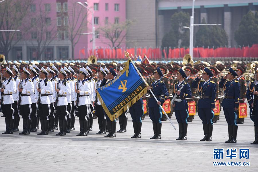 这是4月15日在朝鲜首都平壤拍摄的阅兵式现场。朝鲜15日在平壤举行纪念金日成诞辰105周年的阅兵式和群众游行,并展示了朝鲜最先进的导弹装备。新华社记者程大雨摄