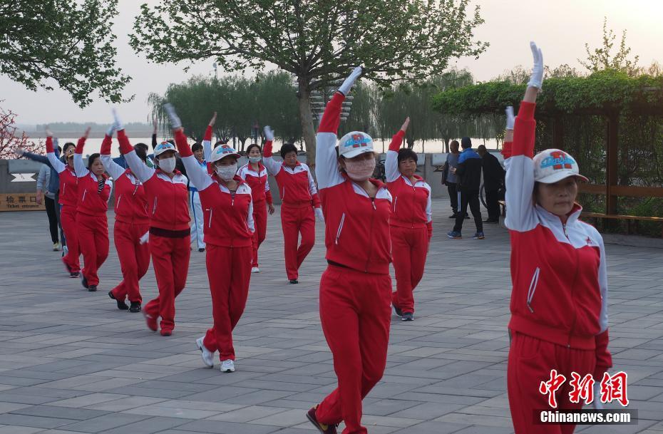 4月16日,雄安新区,在白洋淀畔晨练的人们。中新社记者 毛建军 摄