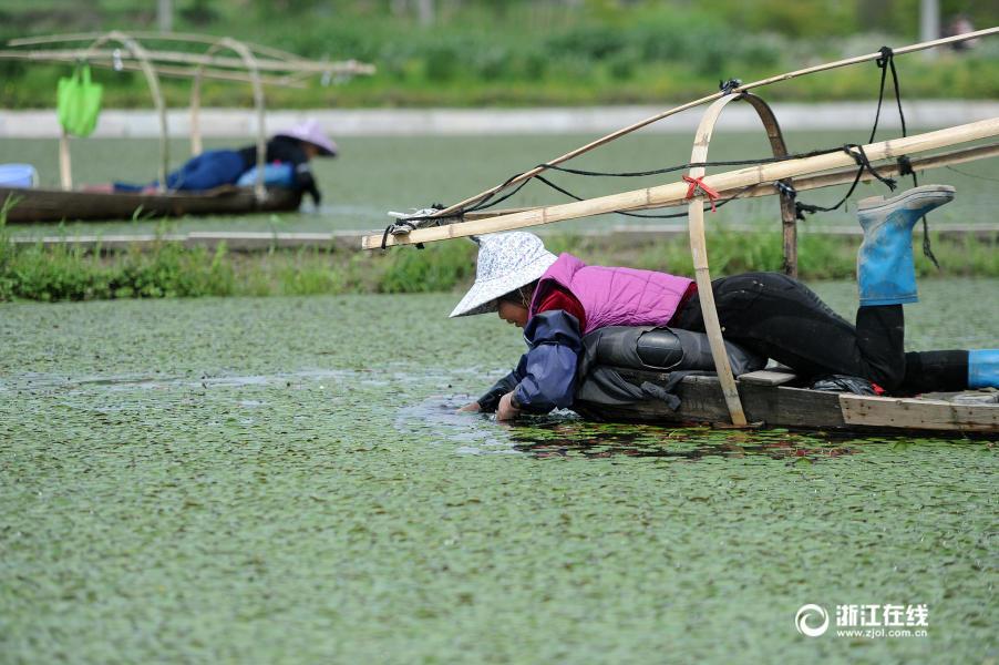 4月18日,杭州西湖区双浦镇铜鉴湖村村民在采收西湖莼菜。在100多亩的水塘里,妇女们一个个趴在小船上采收,胸口垫着一个用橡胶内胎做的垫子。浙江在线杨朝波 吴元峰 摄