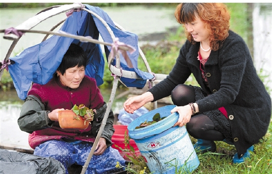 村民宋玉花(左)把采收上来的西湖莼菜交给女儿。