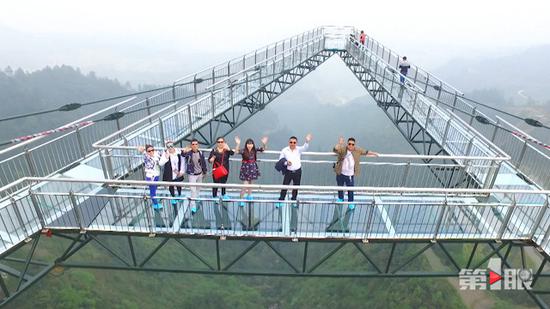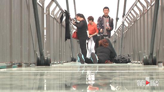 在桥的中段还不足以让记者赶到紧张,甚至还怀揣着“一览众山小”的心情。真正刺激的在于桥的末端,也就是A字的顶尖处,因为向外延伸了87米,一旦有横风吹过的时候,悬廊就会跟着微微晃动,记者的腿开始不自觉地打闪闪。有很多胆大的游客在兴奋地自拍,有的游客则紧紧抓住栏杆,甚至还有人趴在地上。