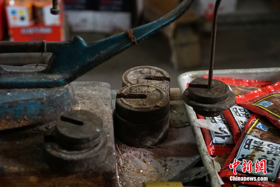 所有进店的人,都会被这个台秤吸引。店铺老板介绍说,从开业至今很多东西都换过,但是这个台秤是始终都在的。秤砣已经锈迹斑斑,秤上也沾满了各种酱料,证明着自己悠久的历史。中新网记者 李卿 摄