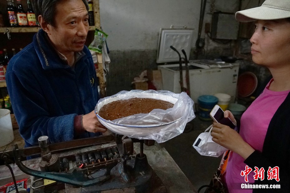 顾客买了黄酱三袋,每袋重三斤,又买了芝麻酱两袋,最后实在提不动了,才打消了继续购买韭菜黄酱的念头。老板说,如果今后这里拆迁了,想吃地道的酱料,可以去厂家购买,并告知了顾客厂家的位置。中新网记者 李卿 摄