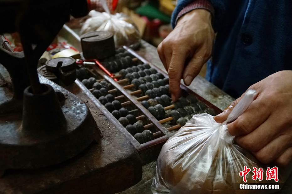 老板用塑料袋分装好酱料,用算盘结算找零数目。买酱的女士称,这个酱料的味道非常浓郁,还准备去内蒙的时候把买的芝麻酱带着,去那边涮羊肉吃。店内没有计算器,每一笔买卖都是用算盘来完成。老板称,从自己是学徒的时候就用的算盘,这门手艺也就一直用下来了。中新网记者 李卿 摄