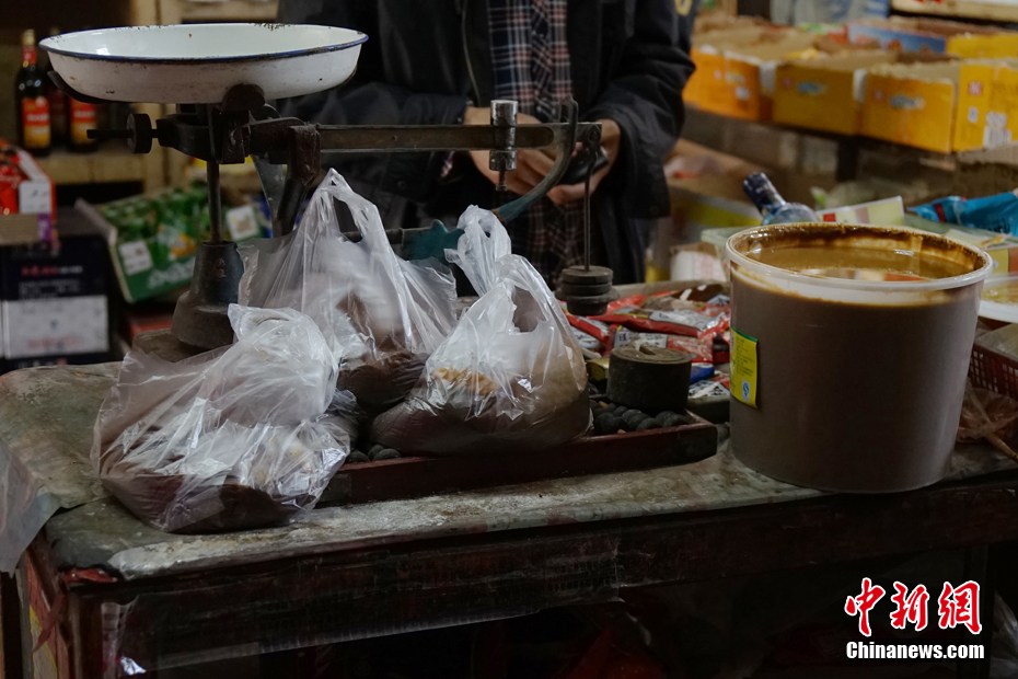 聊天时,老板笑称,他自己比较懒,开店并不是为了发财。副食店卖的商品也都是些小利润的买卖,能赚到吃饭的钱就足够了。副食店里销量最好的,莫过于各类酱料。黄酱、芝麻酱、韭菜花酱、腐乳……即便是不熟悉店铺的顾客,在路过的时候也很容易被浓郁的酱香吸引进来。图为老板在给买酱的顾客称重算钱。中新网记者 李卿 摄