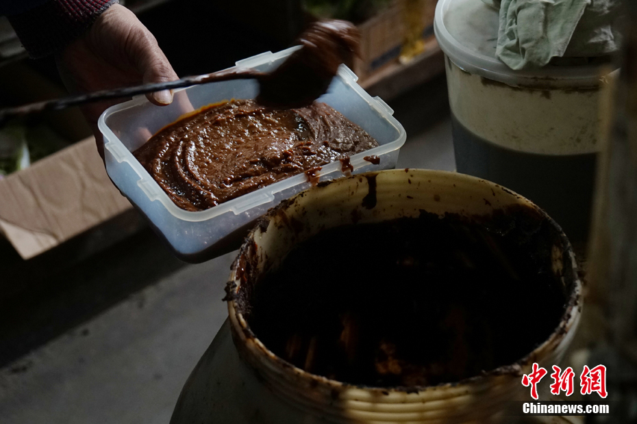 进来买酱的,多数是街坊邻居,他们都拿着自家的饭盆和罐子盛酱。买酱的顾客中不乏上了岁数的老人,他们都认准了这家店铺的酱料,认为这才是他们心中的老北京味道。图为副食店老板给顾客盛黄酱。中新网记者 李卿 摄