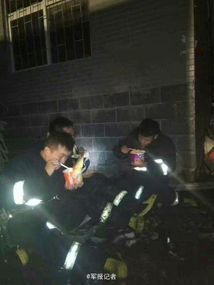 经过近30个小时的全力营救,火终于被扑灭,战士们累得直接睡着了。