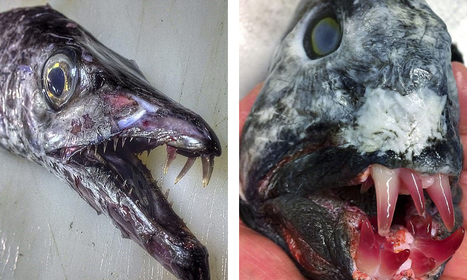 左侧的鱼俗称“刀鞘鱼”,学名为“黑等鳍叉尾带鱼”,生活在海底180米至1700米。铜黑色的皮肤能够让它在捕猎小鱼时掩藏踪迹。右侧为“太平洋狼鱼”,有强力的上下颚以及四至六颗尖长的獠牙。其猎物包括贝类、小鱼、以及棘皮动物。