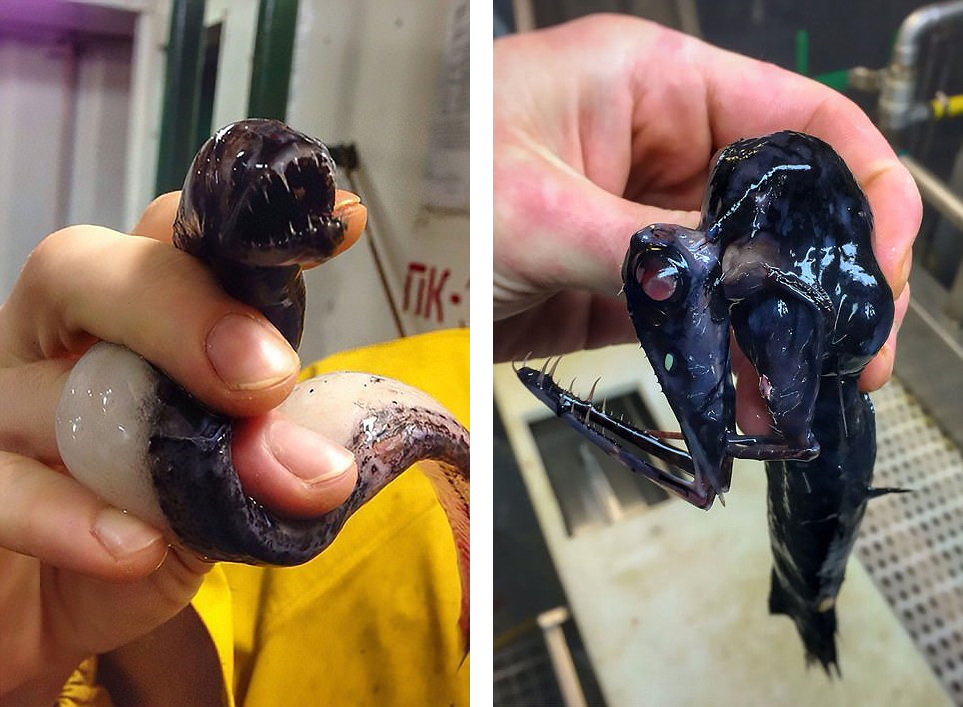右侧为一条“红灯松颚龙鱼”(俗称捕鼠夹鱼)。这种小型深海鱼生存于500米下的深海,通常用鼻孔边的三只发光器来吸引小鱼,然后迅速将他们夹住并在食道中数排牙齿的帮助下吞入胃部。