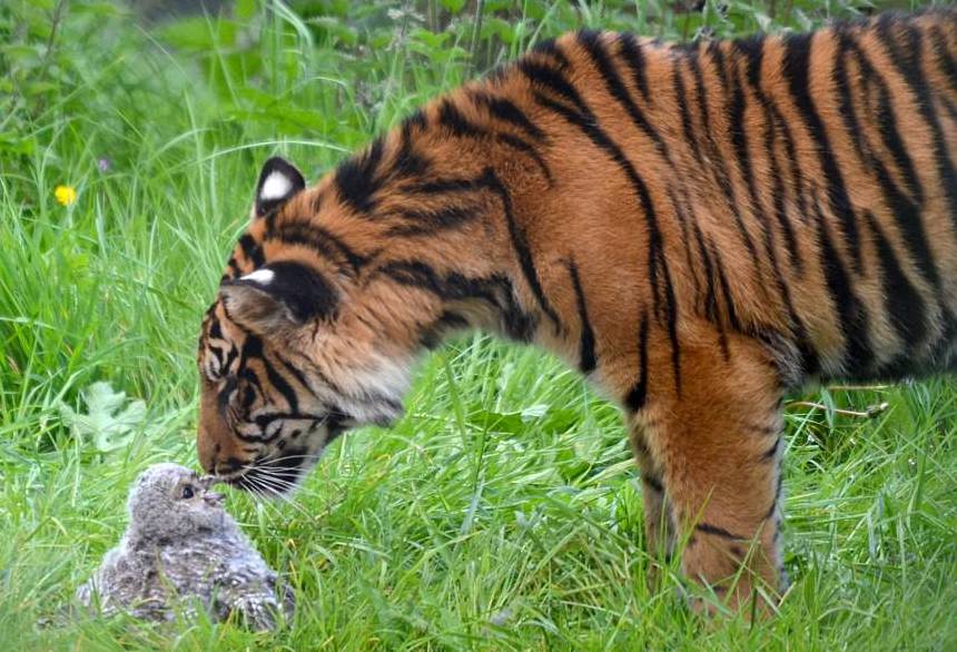 事发前,这只还不太会飞的小猫头鹰从树上掉入虎山,正巧落在一头年轻的苏门答腊虎面前的草地上。