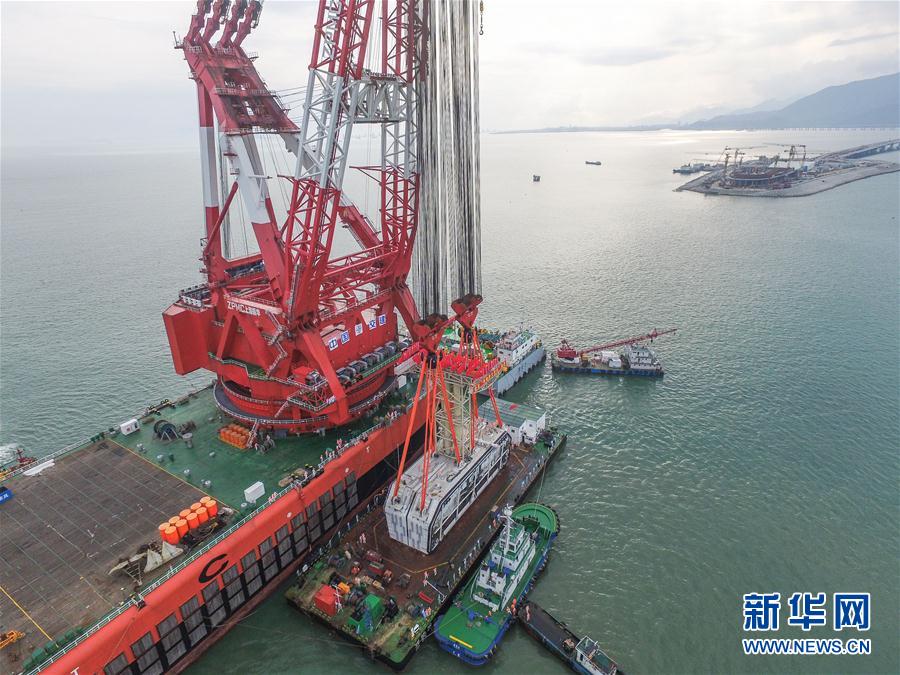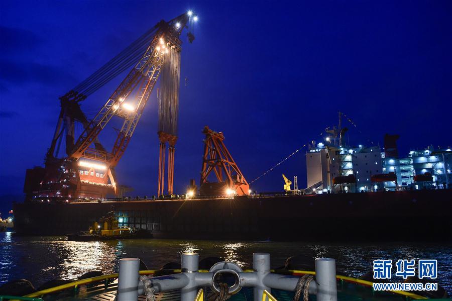5月2日,“振华30”起重船吊起重约6000吨的最终接头,准备放到预定位置。