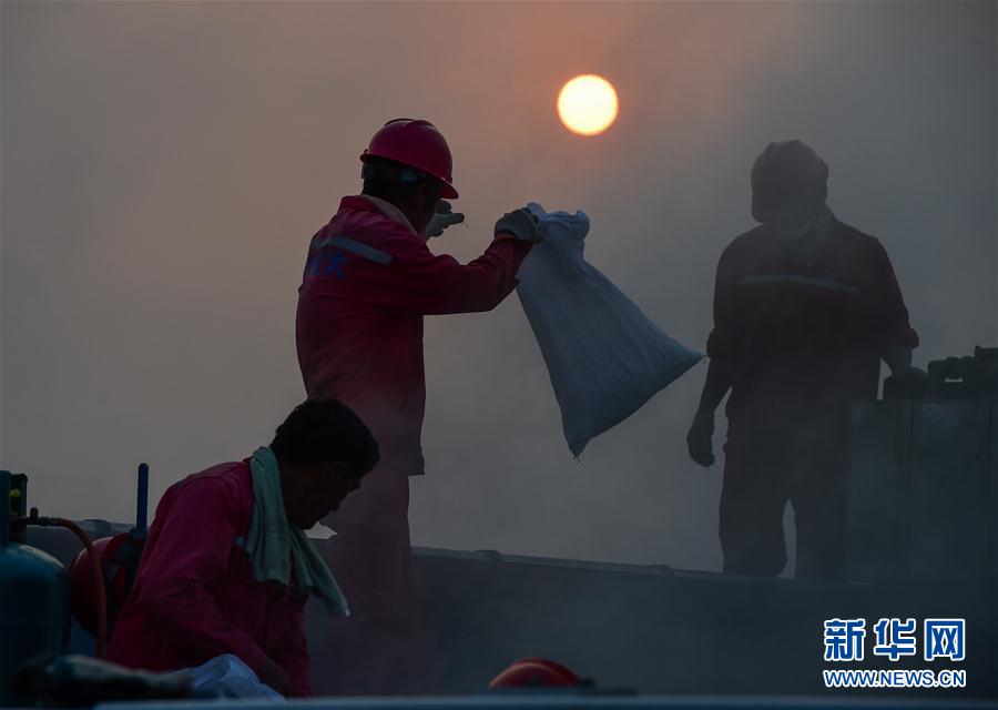 正在铺设沥青的港珠澳大桥江海航段桥面,红色是铺设沥青前的保护涂层(4月29日摄)。新华社记者刘大伟摄