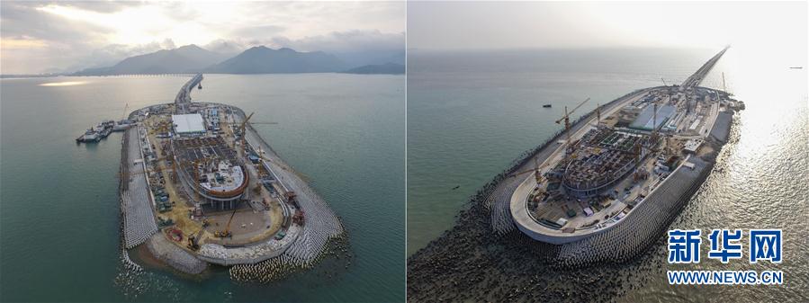 港珠澳大桥的东人工岛(左图,4月28日摄)和西人工岛(右图,5月2日摄)。 新华社记者刘大伟摄