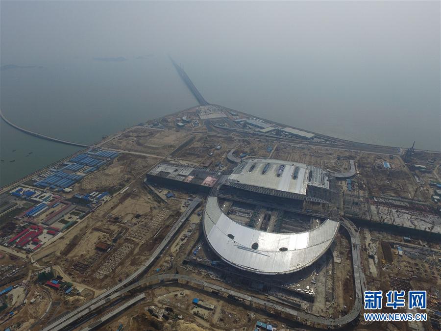 5月3日,港珠澳大桥珠海口岸旅检大楼合龙。一桥连通三地气势如虹,人工岛秀美,旅检大楼蔚为壮观,格力地产、中建钢构、中建三局、广东长大等建设者为大桥工程建设砥砺奋战,初现端容,离通车目标更近了一步。中新社记者 陈文 摄