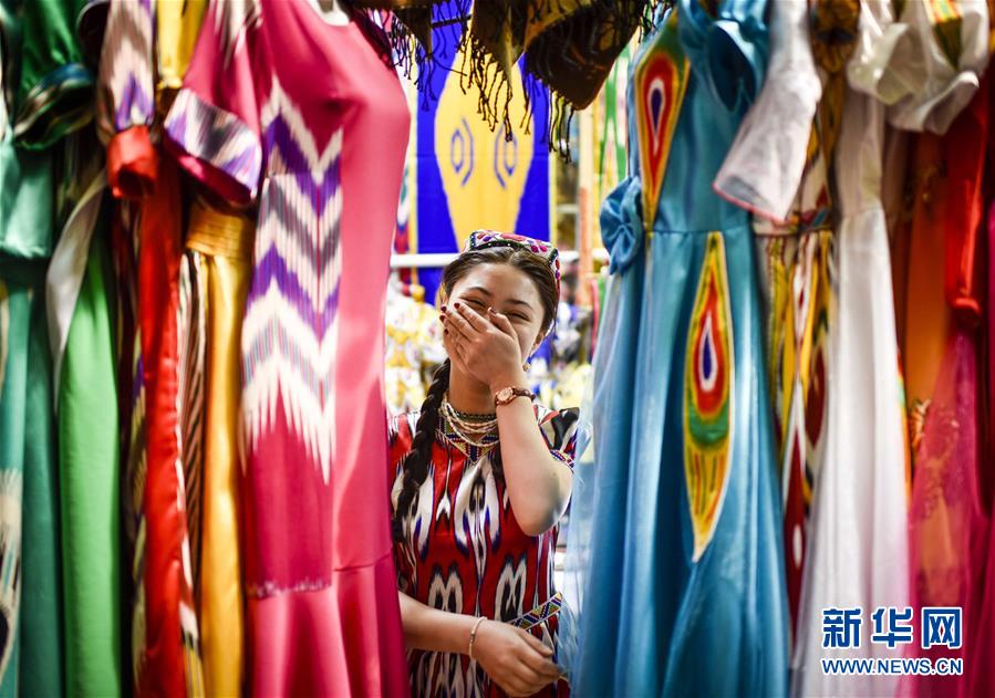 在乌鲁木齐地标性建筑——新疆国际大巴扎里,经营丝绸生意的麦迪娜在店铺里休息(4月24日摄)。新华社记者 赵戈 摄