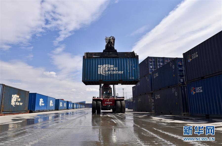 在中欧(中亚)班列乌鲁木齐集结中心,一辆集装箱正面起重机在作业中(4月27日摄)。新华社发(胡虎虎 摄)