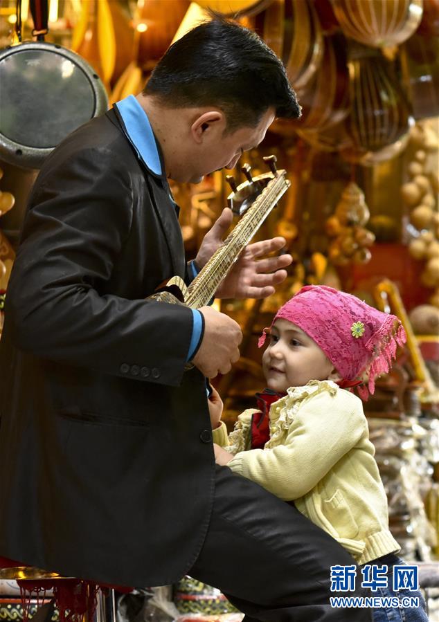 在新疆国际大巴扎丝绸之路商业步行街内,乐器店老板阿不来提江在弹奏传统乐器,女儿姆丽莎在身旁玩耍(4月26日摄)。新华社发(胡虎虎摄)