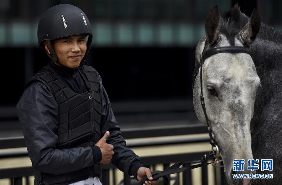 位于乌鲁木齐市的野马集团汗血马基地里,一位骑手在表演结束后牵着汗血宝马离开场地(4月29日摄)。新华社发(胡虎虎摄)