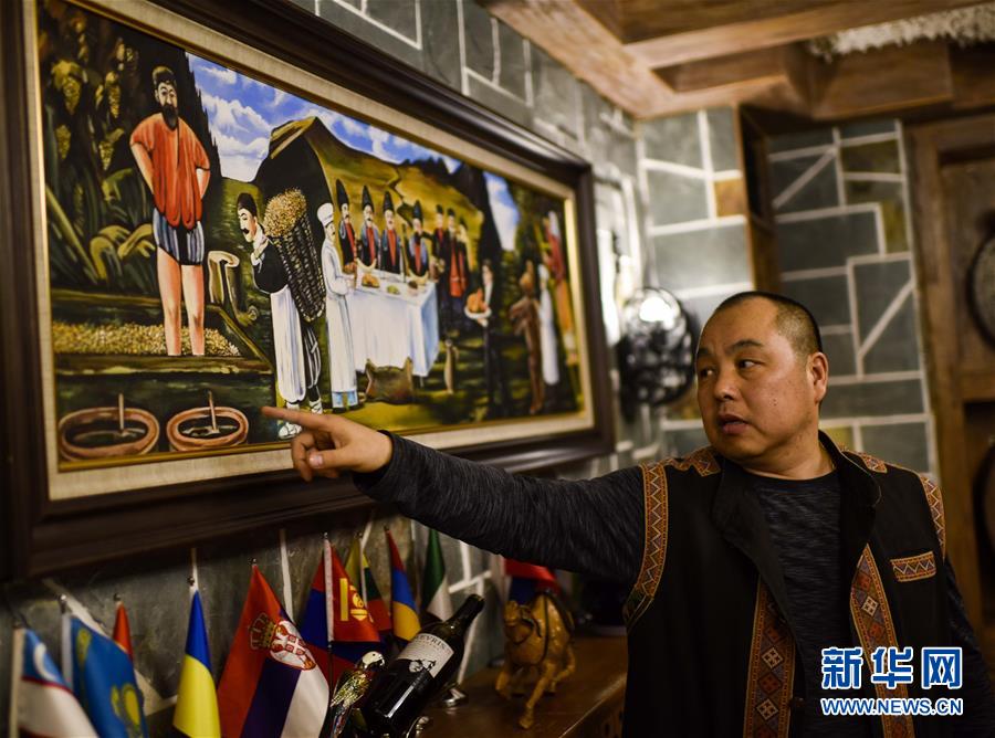 在乌鲁木齐一家经营外国美食的餐厅里,餐厅负责人佟建生在介绍格鲁吉亚风情(4月23日摄)。新华社记者 赵戈 摄
