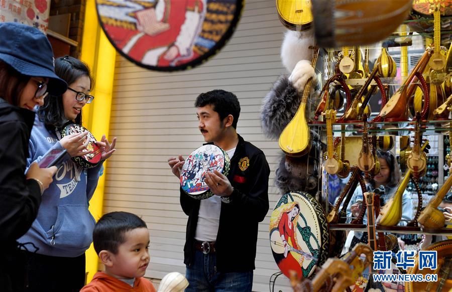 游客在位于乌鲁木齐的新疆国际大巴扎上选购当地民间乐器(4月24日摄)。新华社记者 王菲 摄