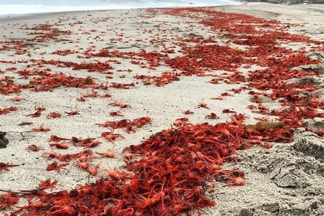 近日,美国加州的南海附近,整片沙滩都被密密麻麻麻的小龙虾覆盖。图中不是过节后的鞭炮碎屑,也不是红叶,而是千万小龙虾组成的“入侵大军”。