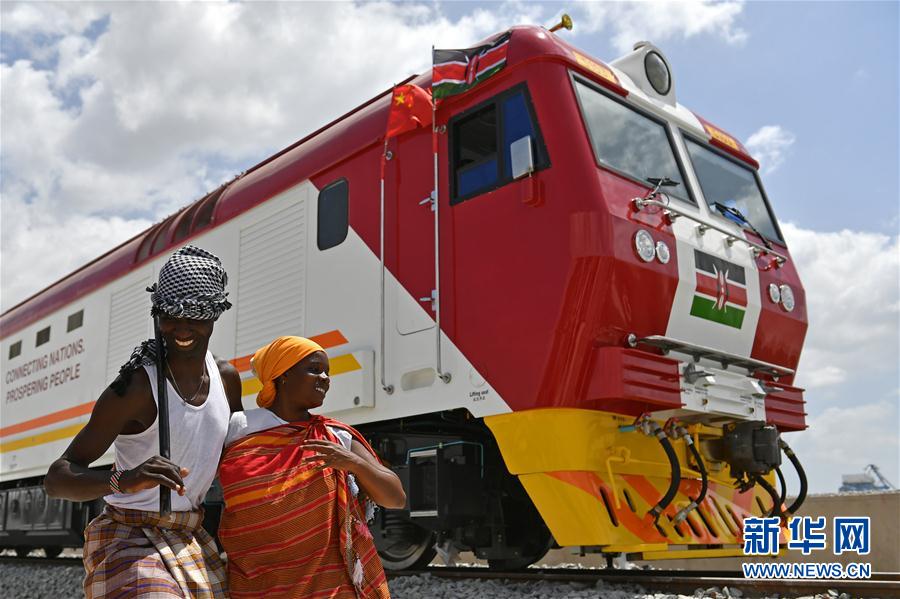 这是2017年1月11日,肯尼亚蒙巴萨民众在蒙内铁路首批内燃机车旁载歌载舞。蒙内铁路是肯尼亚独立百年来建设的首条铁路,由中交集团总承包,中国路桥承建,预计于2017年6月建成通车。新华社记者孙瑞博摄