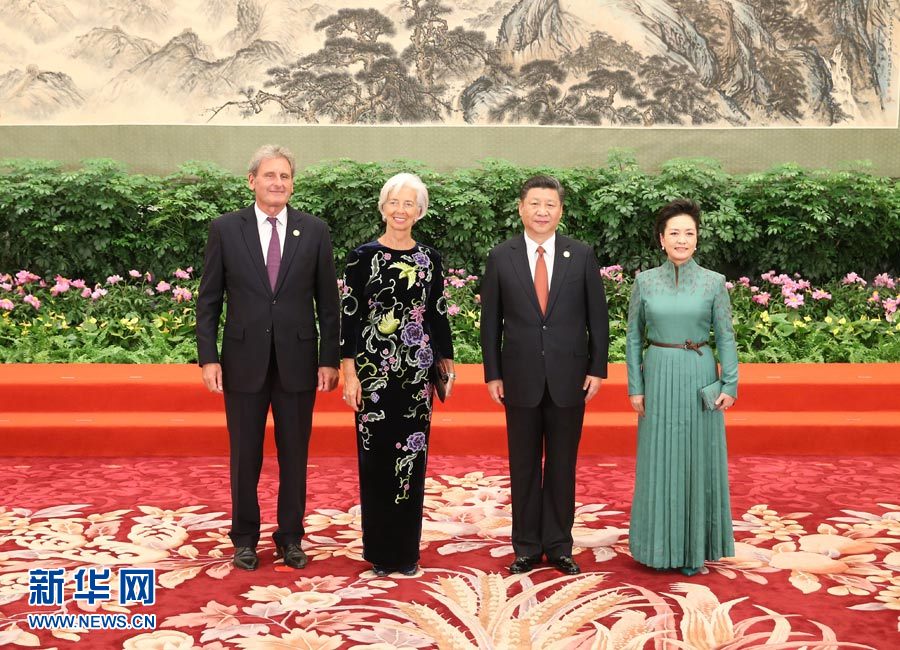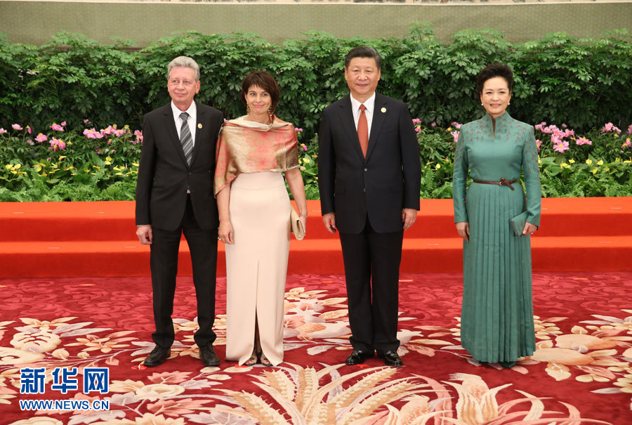 5月14日,国家主席习近平在北京人民大会堂举行宴会,欢迎出席“一带一路”国际合作高峰论坛的外方代表团团长及嘉宾。这是习近平和夫人彭丽媛迎候瑞士联邦主席洛伊特哈德和丈夫。新华社记者 姚大伟 摄