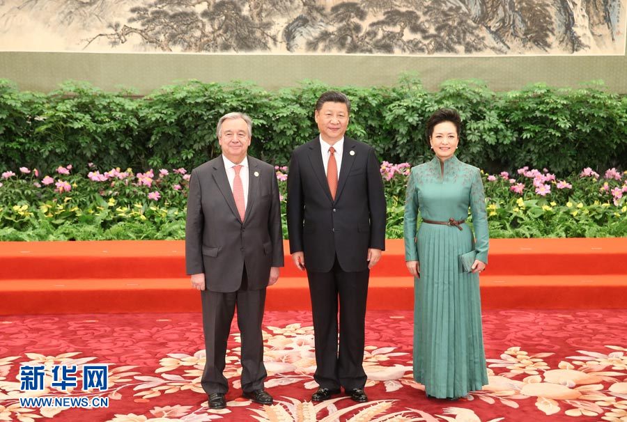 5月14日,国家主席习近平在北京人民大会堂举行宴会,欢迎出席“一带一路”国际合作高峰论坛的外方代表团团长及嘉宾。这是习近平和夫人彭丽媛迎候联合国秘书长古特雷斯。新华社记者 姚大伟 摄