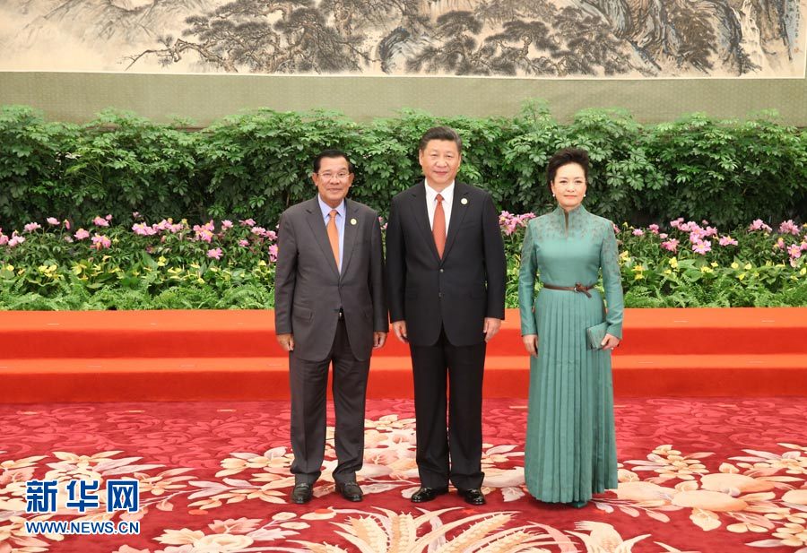 5月14日,国家主席习近平在北京人民大会堂举行宴会,欢迎出席“一带一路”国际合作高峰论坛的外方代表团团长及嘉宾。这是习近平和夫人彭丽媛迎候柬埔寨首相洪森。新华社记者 姚大伟 摄
