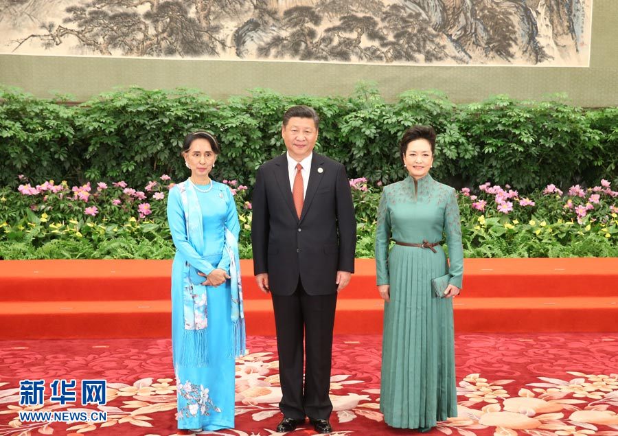5月14日,国家主席习近平在北京人民大会堂举行宴会,欢迎出席“一带一路”国际合作高峰论坛的外方代表团团长及嘉宾。这是习近平和夫人彭丽媛迎候缅甸国务资政昂山素季。新华社记者 姚大伟 摄