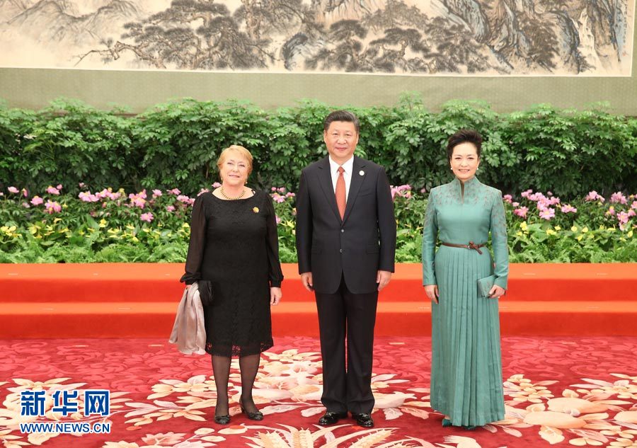 5月14日,国家主席习近平在北京人民大会堂举行宴会,欢迎出席“一带一路”国际合作高峰论坛的外方代表团团长及嘉宾。这是习近平和夫人彭丽媛迎候智利总统巴切莱特。新华社记者 姚大伟 摄