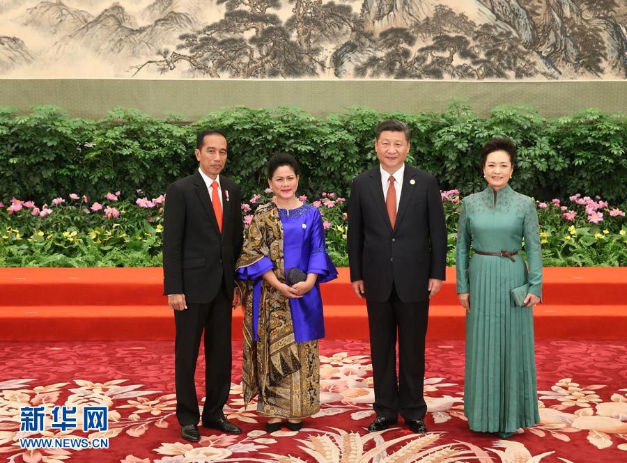 5月14日,国家主席习近平在北京人民大会堂举行宴会,欢迎出席“一带一路”国际合作高峰论坛的外方代表团团长及嘉宾。这是习近平和夫人彭丽媛迎候印度尼西亚总统佐科和夫人。新华社记者 姚大伟 摄