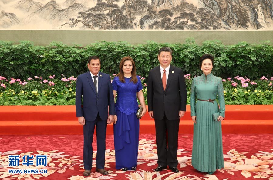5月14日,国家主席习近平在北京人民大会堂举行宴会,欢迎出席“一带一路”国际合作高峰论坛的外方代表团团长及嘉宾。这是习近平和夫人彭丽媛迎候菲律宾总统杜特尔特和阿梵西那女士。新华社记者 姚大伟 摄