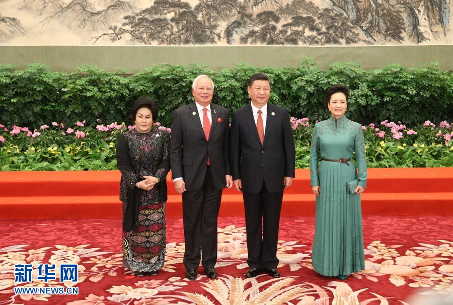 5月14日,国家主席习近平在北京人民大会堂举行宴会,欢迎出席“一带一路”国际合作高峰论坛的外方代表团团长及嘉宾。这是习近平和夫人彭丽媛迎候马来西亚总理纳吉布和夫人。新华社记者 姚大伟 摄