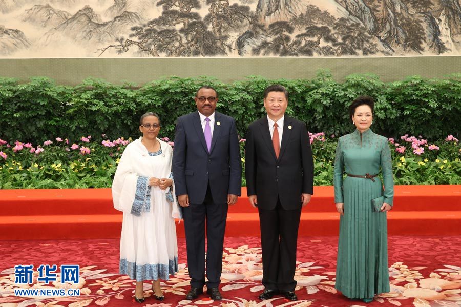 5月14日,国家主席习近平在北京人民大会堂举行宴会,欢迎出席“一带一路”国际合作高峰论坛的外方代表团团长及嘉宾。这是习近平和夫人彭丽媛迎候埃塞俄比亚总理海尔马里亚姆和夫人。新华社记者 姚大伟 摄