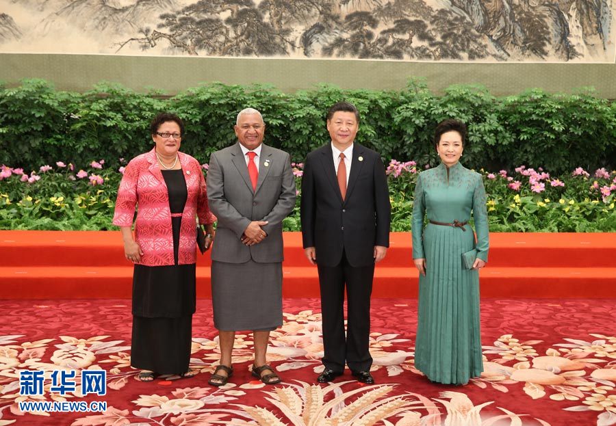 5月14日,国家主席习近平在北京人民大会堂举行宴会,欢迎出席“一带一路”国际合作高峰论坛的外方代表团团长及嘉宾。这是习近平和夫人彭丽媛迎候斐济总理姆拜尼马拉马和夫人。新华社记者 姚大伟 摄