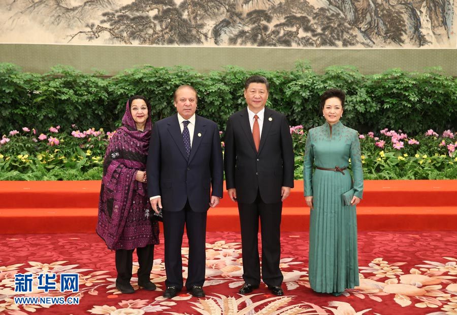 5月14日,国家主席习近平在北京人民大会堂举行宴会,欢迎出席“一带一路”国际合作高峰论坛的外方代表团团长及嘉宾。这是习近平和夫人彭丽媛迎候巴基斯坦总理谢里夫和夫人。新华社记者 姚大伟 摄