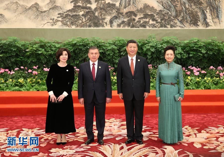 5月14日,国家主席习近平在北京人民大会堂举行宴会,欢迎出席“一带一路”国际合作高峰论坛的外方代表团团长及嘉宾。这是习近平和夫人彭丽媛迎候乌兹别克斯坦总统米尔济约耶夫和夫人。新华社记者 姚大伟 摄