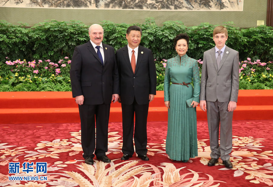 5月14日,国家主席习近平在北京人民大会堂举行宴会,欢迎出席“一带一路”国际合作高峰论坛的外方代表团团长及嘉宾。这是习近平和夫人彭丽媛迎候白俄罗斯总统卢卡申科父子。新华社记者 姚大伟 摄