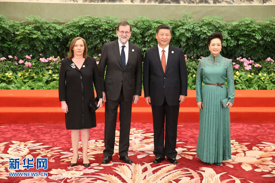 5月14日,国家主席习近平在北京人民大会堂举行宴会,欢迎出席“一带一路”国际合作高峰论坛的外方代表团团长及嘉宾。这是习近平和夫人彭丽媛迎候西班牙首相拉霍伊和夫人。新华社记者 姚大伟 摄